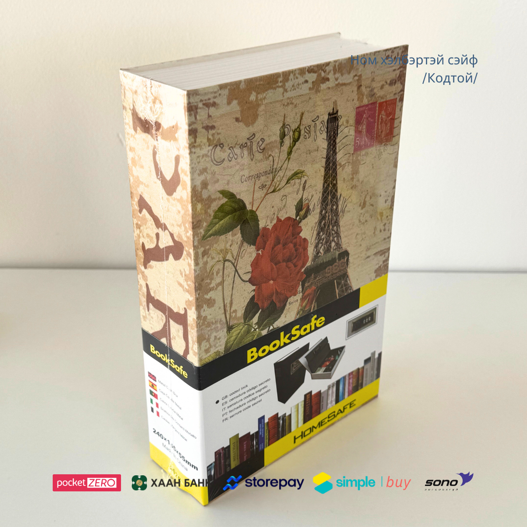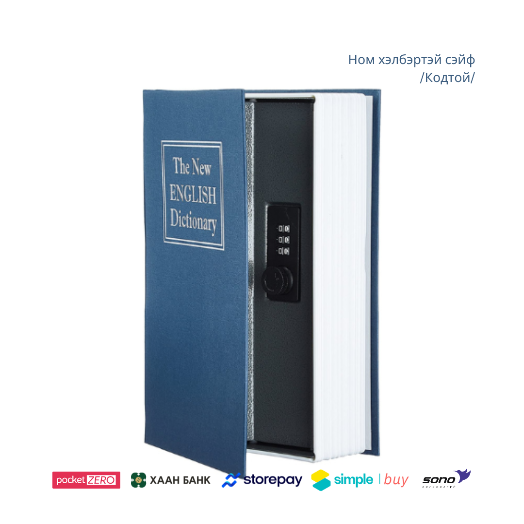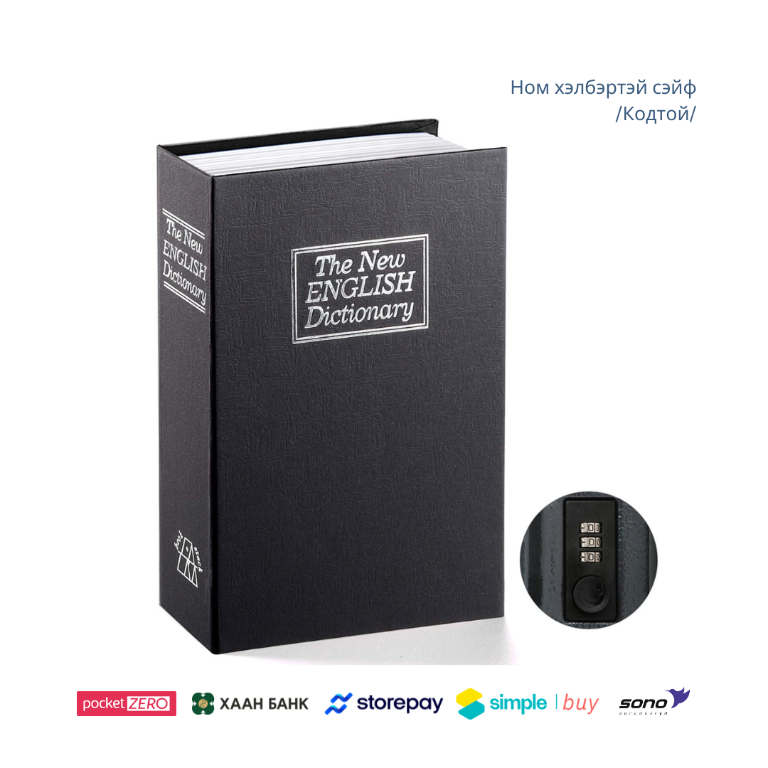 Тус сэйф нь номны тавиур дээр жинхэнэ ном шиг харагдана. Энэ сэйф таны үнэт зүйлс, чухал баримтуудыг /Төрсөний гэрчилгээ, гадаад паспорт, ээмэг, бөгж, зүүлт, мөнгө г.м/ нууж, хамгаалж хадгална.