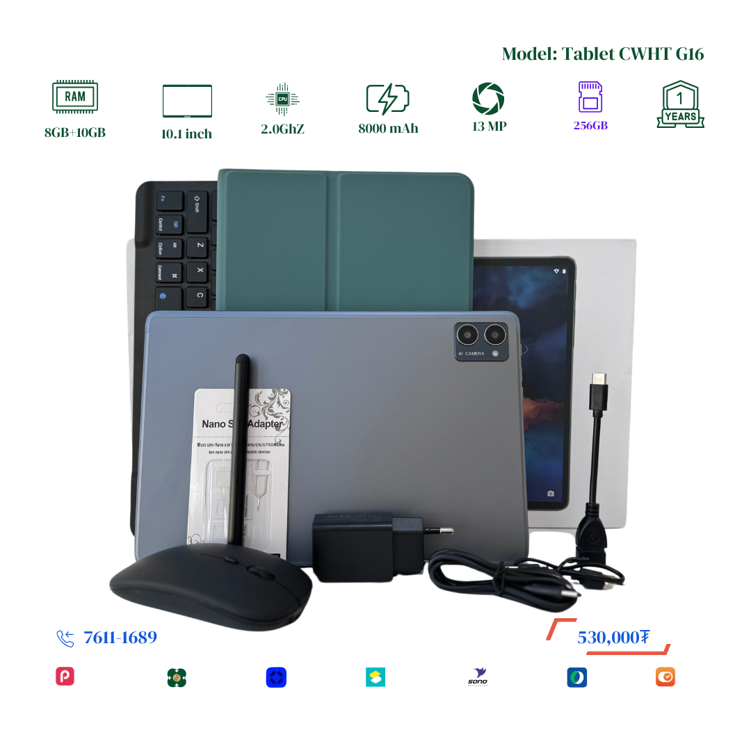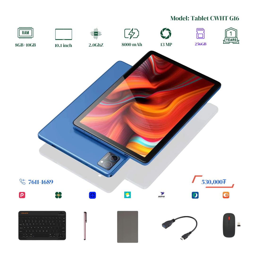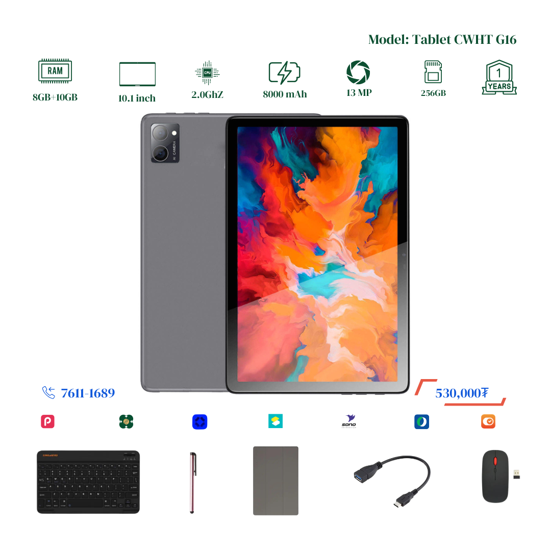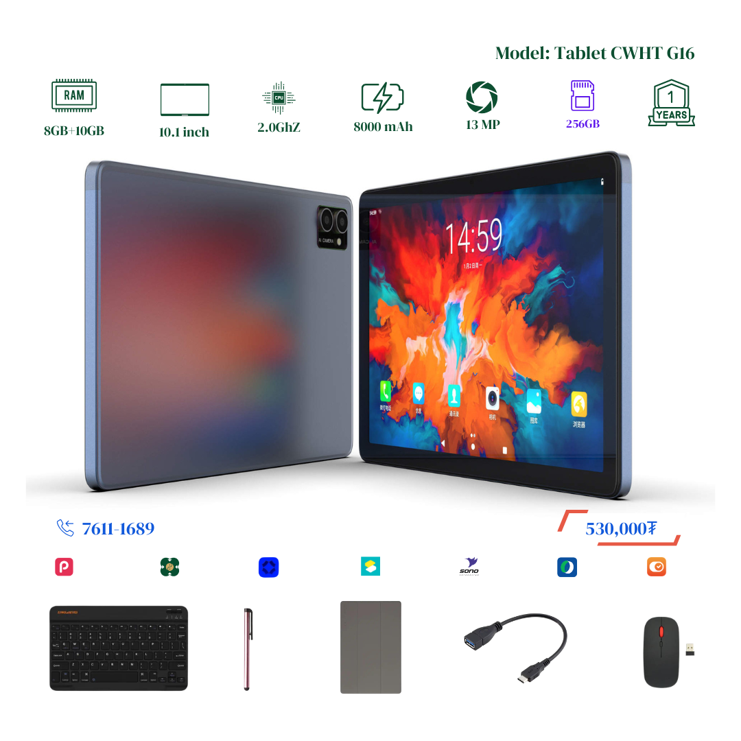 Шинэчлэгдэж сайжирсан тус Tablet нь багтаамж 256GB болж хоёр дахин RAM 8+10GB болж Virtual RAM дэмждэг үйлдэл систем сүүлийн хувилбар болсон бөгөөд Монгол хэл буюу крилл үсэгтэй keyboard-тай болсон байгаа. Display resolution 2000x1200-тай болсон учир илүү тод цэвэрхэн, нягтрал өндөртэй онлайн хичээл, видео, зураг, тоглоом, хурал хийх үзэх боломжтой. 2 сим эсвэл 1 сим TF cart орох боломжтой. Нэмэлтээр keyboard, mouse, үзэг үнэгүй дагалдуулна. Үйлдвэрийн 1 жилийн баталгаатай.