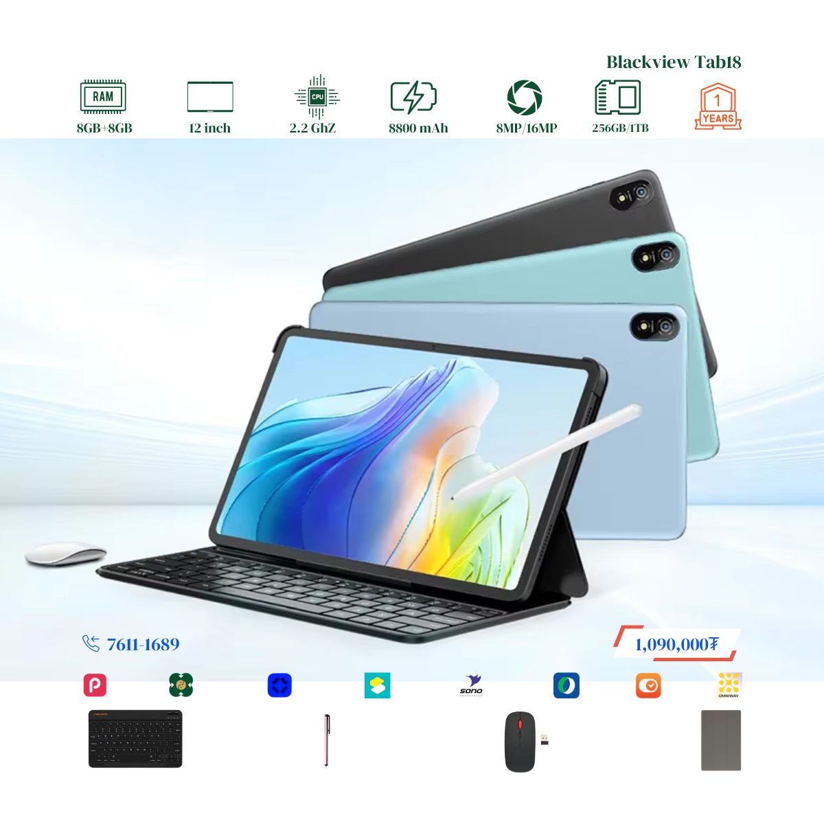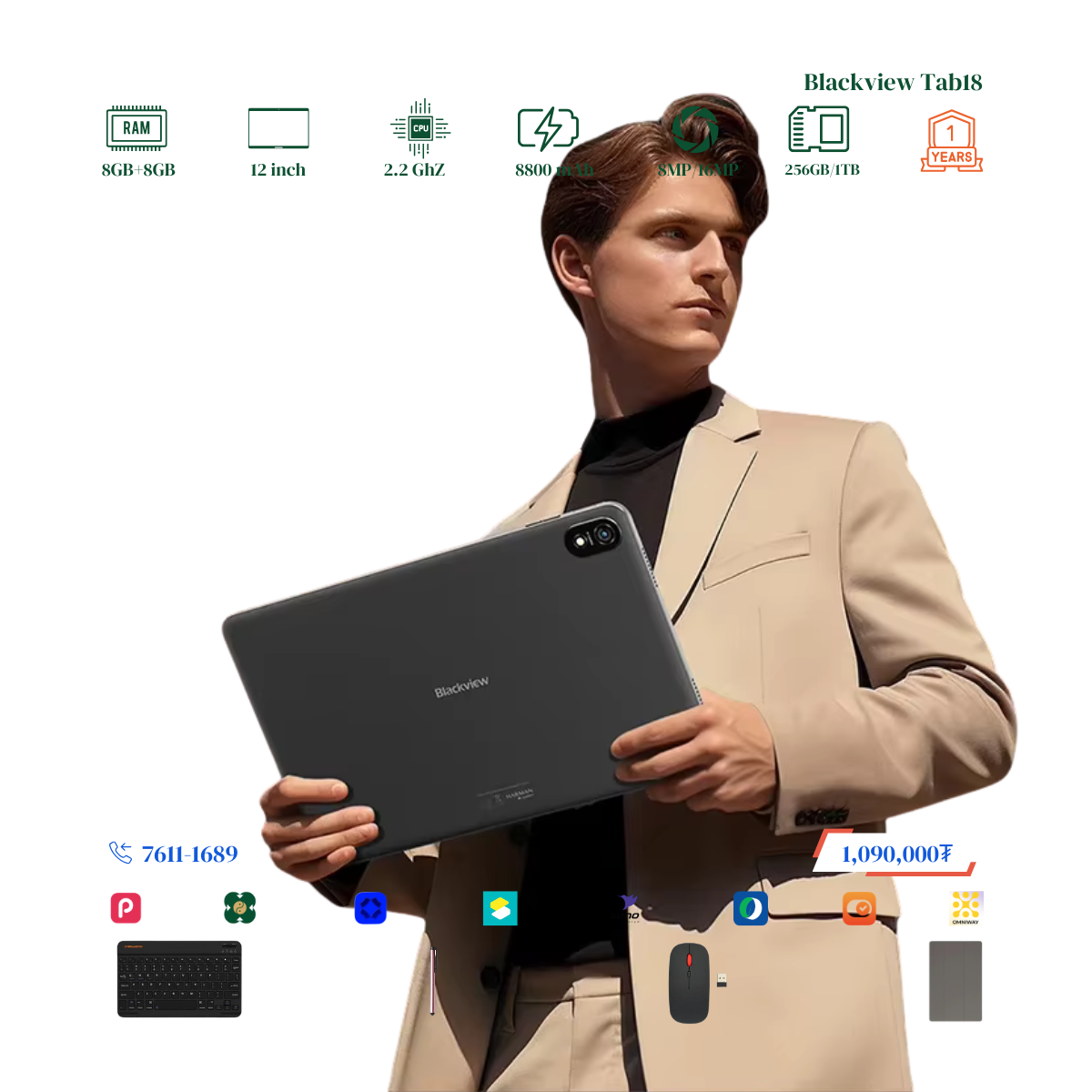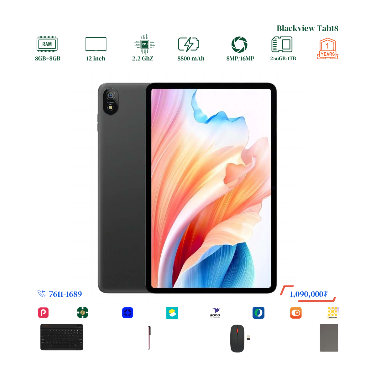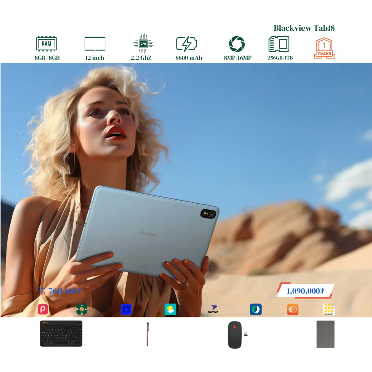 #Blackview брэндийн онцлог нь 12 инчийн Илүү ТОМ дэлгэцтэй, багтаамж #256GB, дэлгэцний нягтрал 2.4K Ultra, хурд нь 8GB+8GB буюу #16GB хүрч RAM-тай. Урд тал 8MP ар тал 16MP-тай камертай. 2 сим эсвэл 1 сим TF cart орох боломжтой. # Blackview брэндийн тус загвар бид нэмэлтээр Монгол хэлтэй keyboard, mouse, үзэг, зөөлөн кейс дагалдуулж олгох болно. Үйлдвэрийн 1 жилийн баталгаатай.