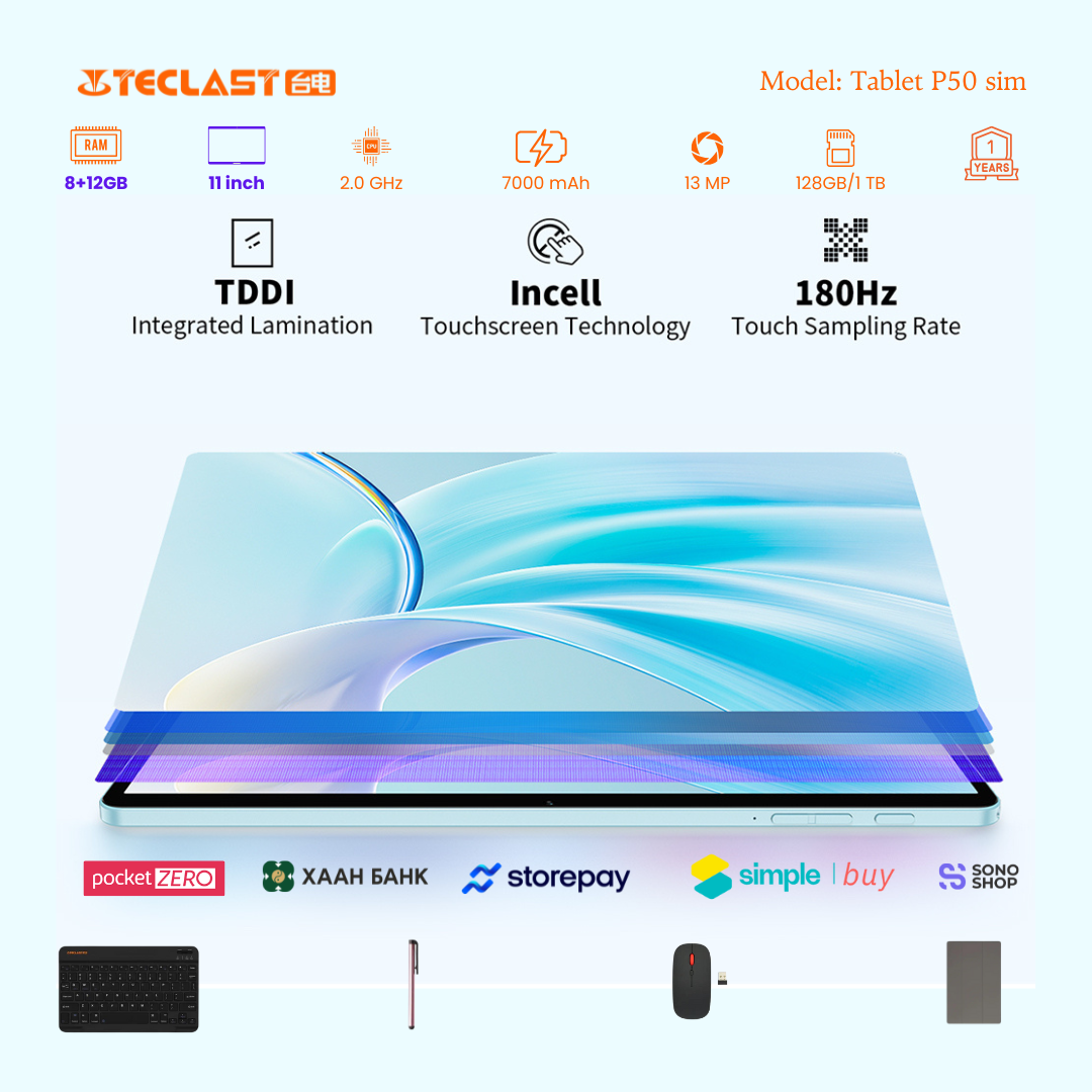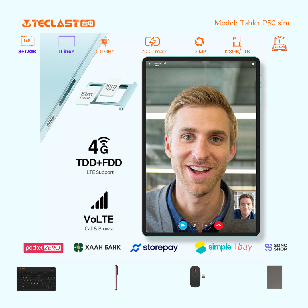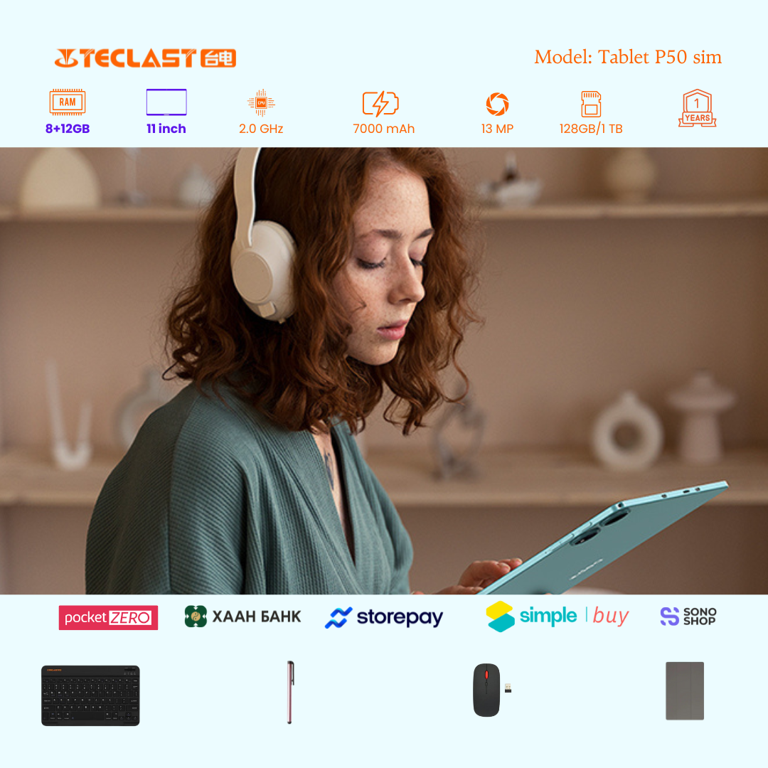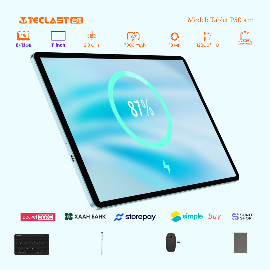 Тус тавлетийн онцлог нь өмнөх загвараас хурд нэмэгдэж 8GB+12GB LPDDR4X буюу 20GB гаргах боломжтой болсон байгаа. Камер 8MP ар тал 13MP-тай бөгөөд 2 сим эсвэл 1 сим TF cart орох боломжтой. #Teclast брэндийн тус загвар бид нэмэлтээр үзэг, keyboard, mouse, зөөлөн кейс дагалдуулж олгох болно. Үйлдвэрийн 1 жилийн баталгаатай.