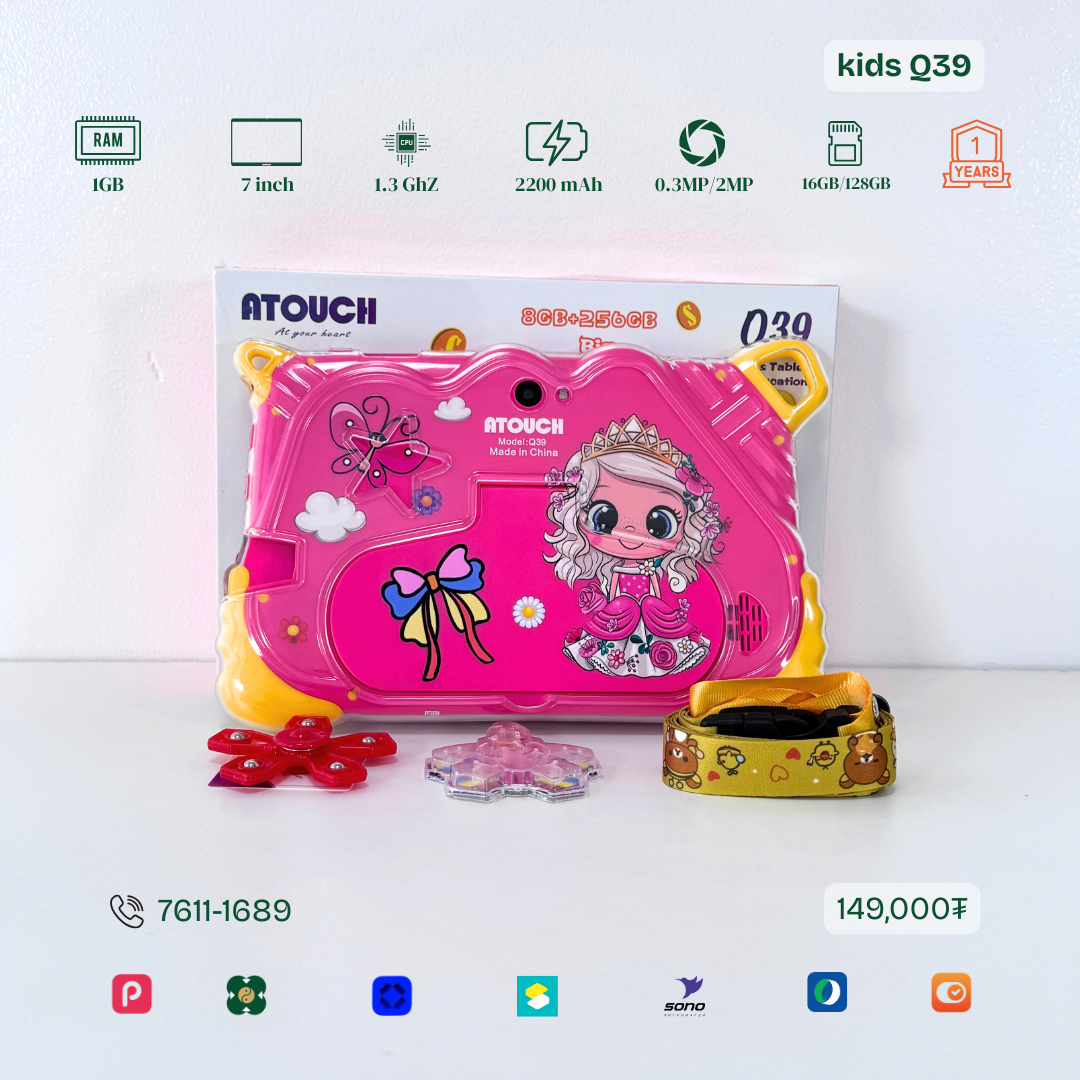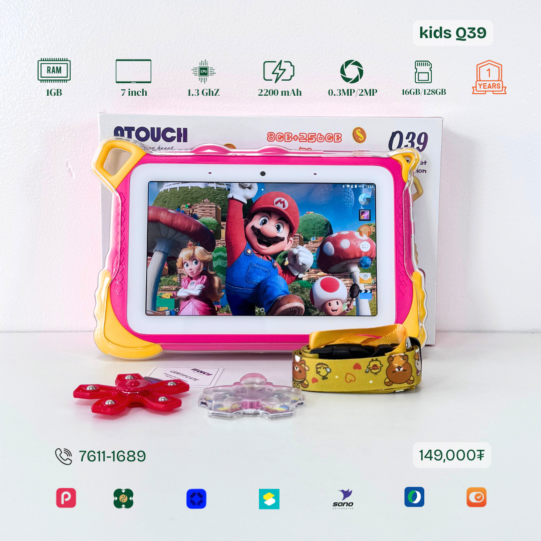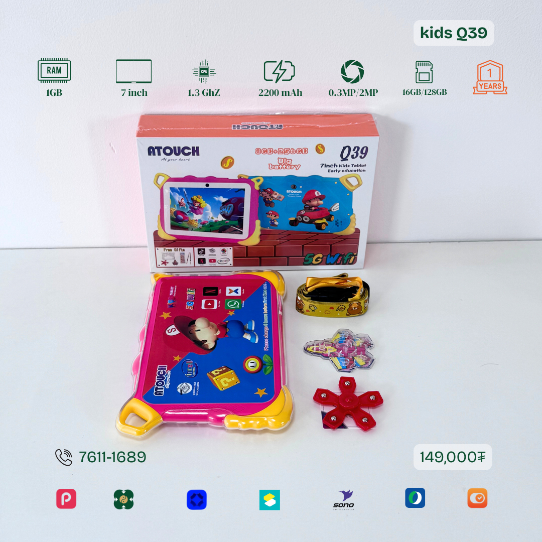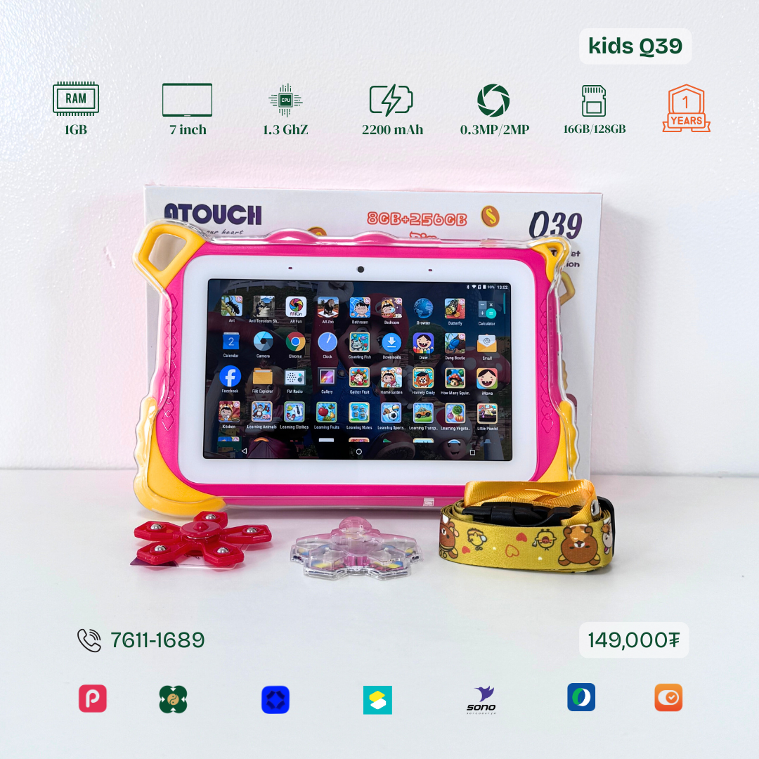 Тус тавлетийн онцлог нь сургуулийн өмнөх бага насны хүүхдэд зориулсан WIFI загвар юм. Бага хурдтай, Youtube ордог. Тоо бодох, Англи хэлний үсэг таних унших, сонсох, бичих төрлийн олон тоглоомтой. TF cart орох боломжтой. Та хүүгүй урьдчилгаагүй авах боломжтой.