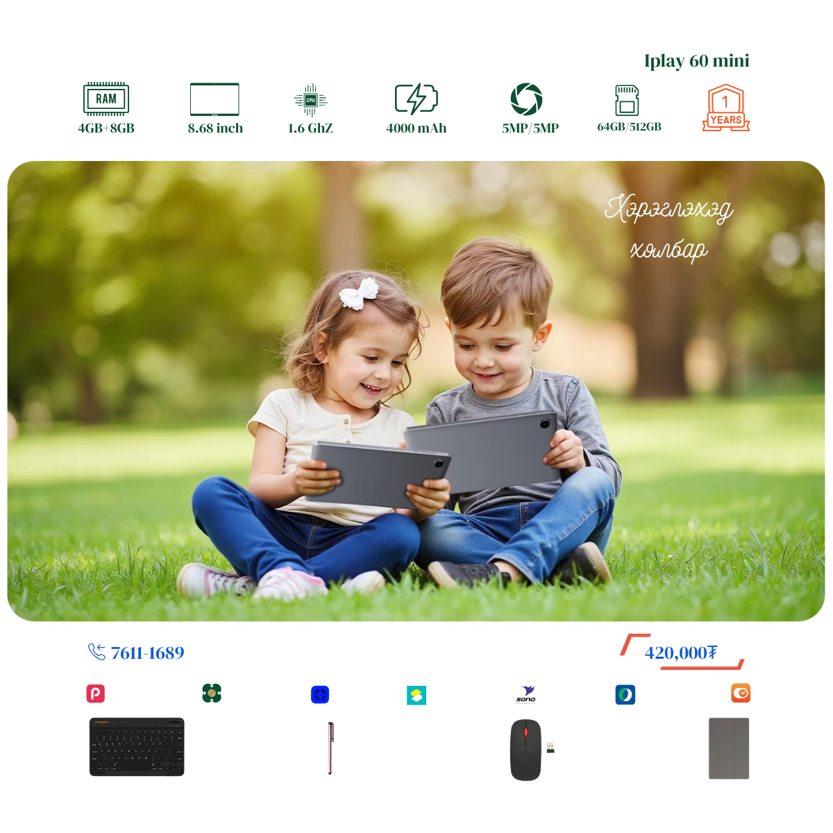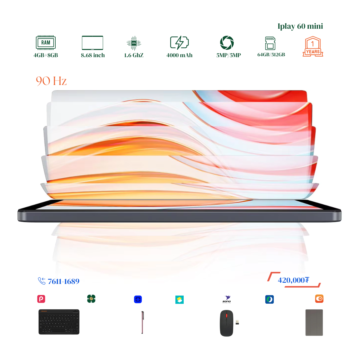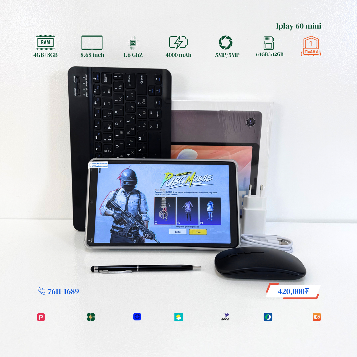 #Alldocube брэндийн онцлог нь дэлгэцний нягтрал 1340x800. Багтаамж 64GB, хурд нь 4GB+8GB буюу #16GB хүрч гаргах боломжтой LPDDR4X RAM-тай. 2 сим эсвэл 1 сим TF cart орох боломжтой6 Тус загварт бид нэмэлтээр үзэг, зөөлөн кейс, Монгол хэлтэй keyboard, mouse дагалдуулж олгоно. Үйлдвэрийн 1 жилийн баталгаатай.