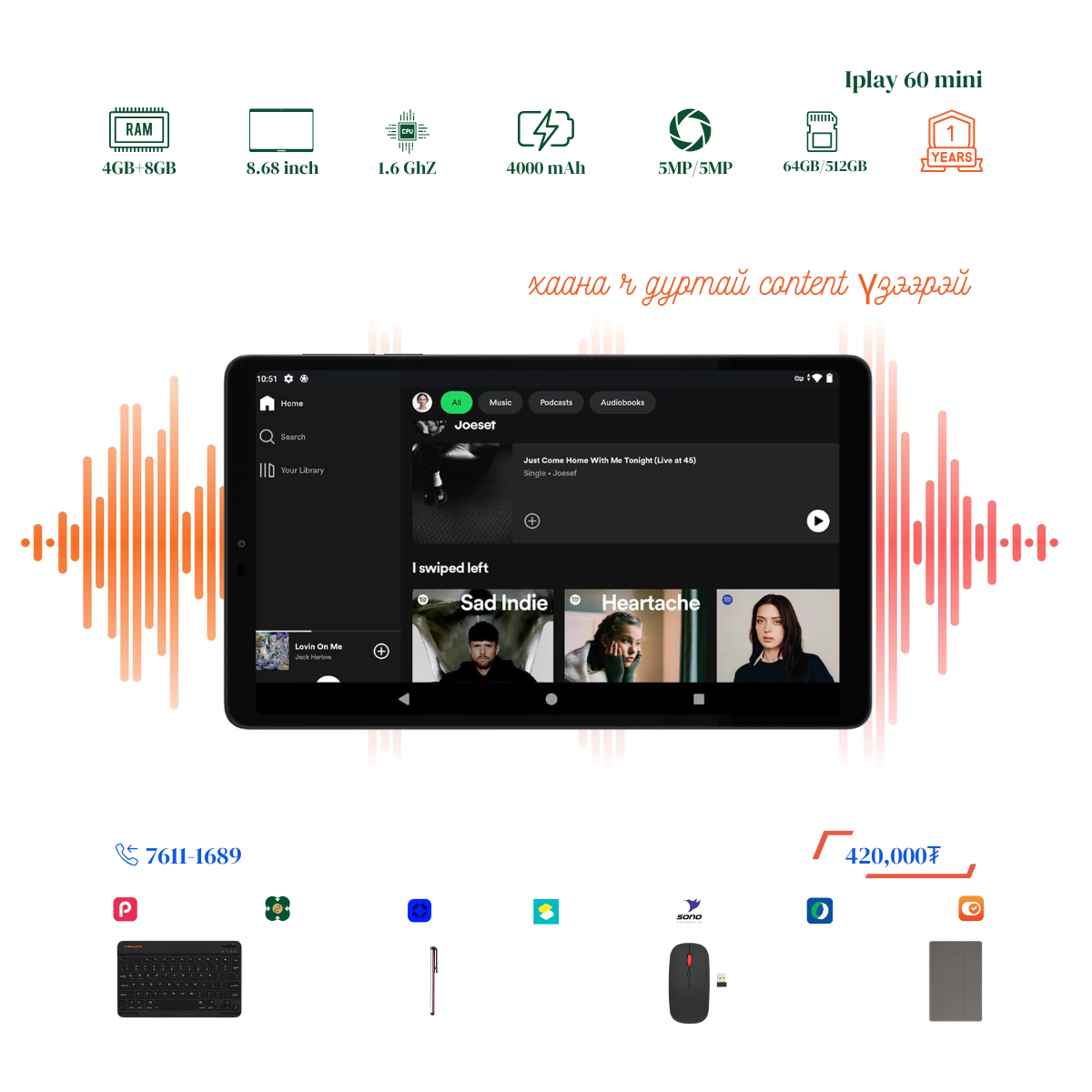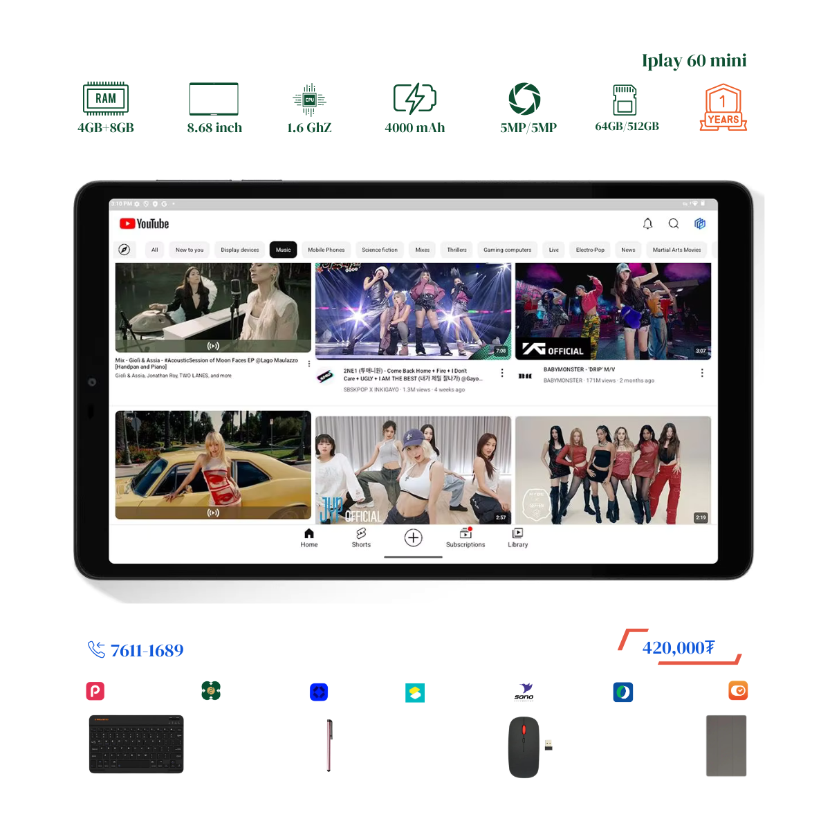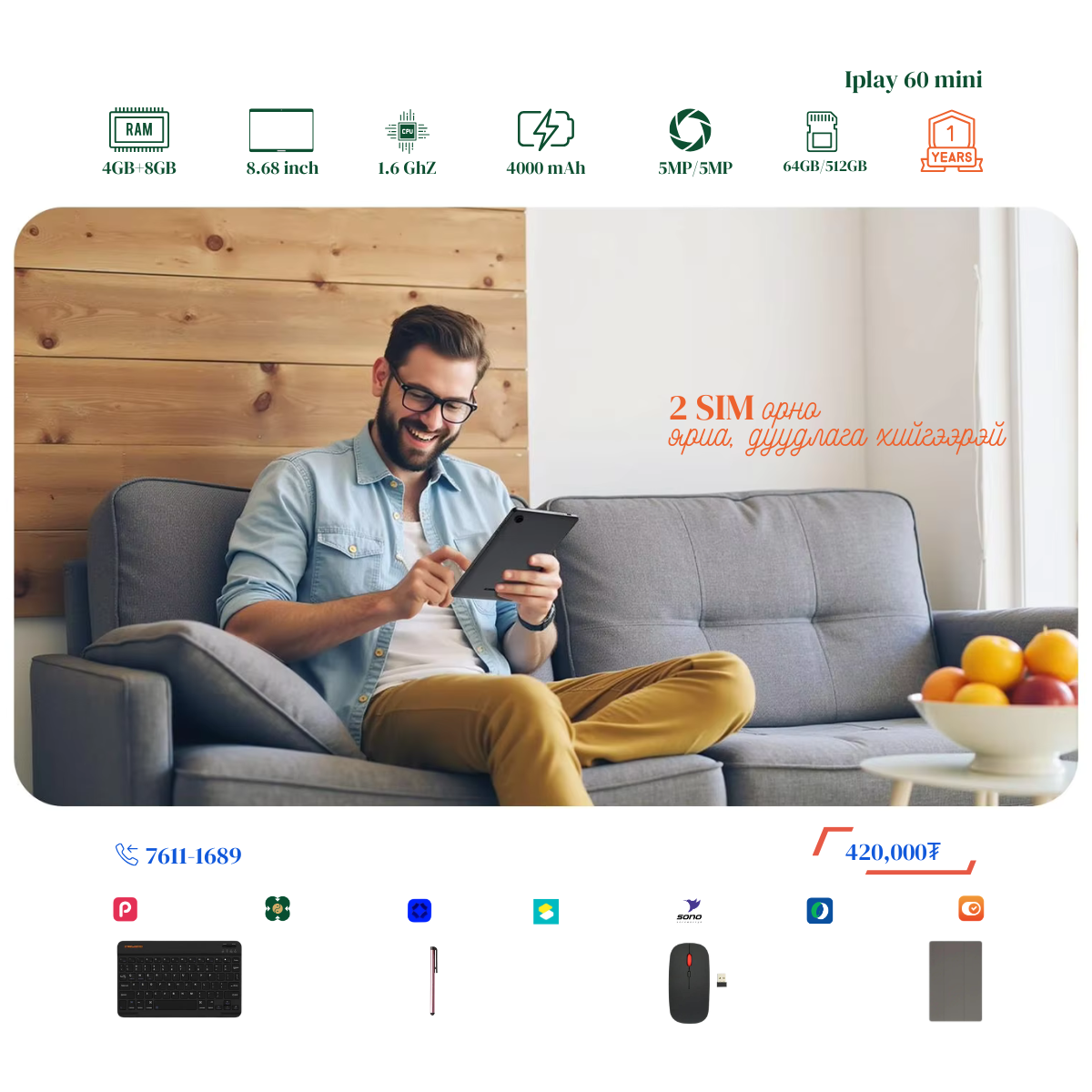 #Alldocube брэндийн онцлог нь дэлгэцний нягтрал 1340x800. Багтаамж 64GB, хурд нь 4GB+8GB буюу #16GB хүрч гаргах боломжтой LPDDR4X RAM-тай. 2 сим эсвэл 1 сим TF cart орох боломжтой6 Тус загварт бид нэмэлтээр үзэг, зөөлөн кейс, Монгол хэлтэй keyboard, mouse дагалдуулж олгоно. Үйлдвэрийн 1 жилийн баталгаатай.