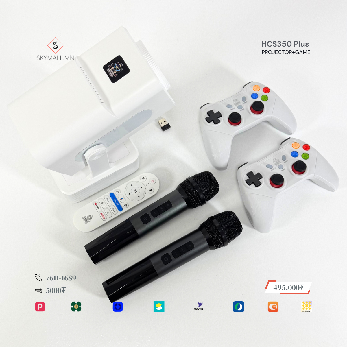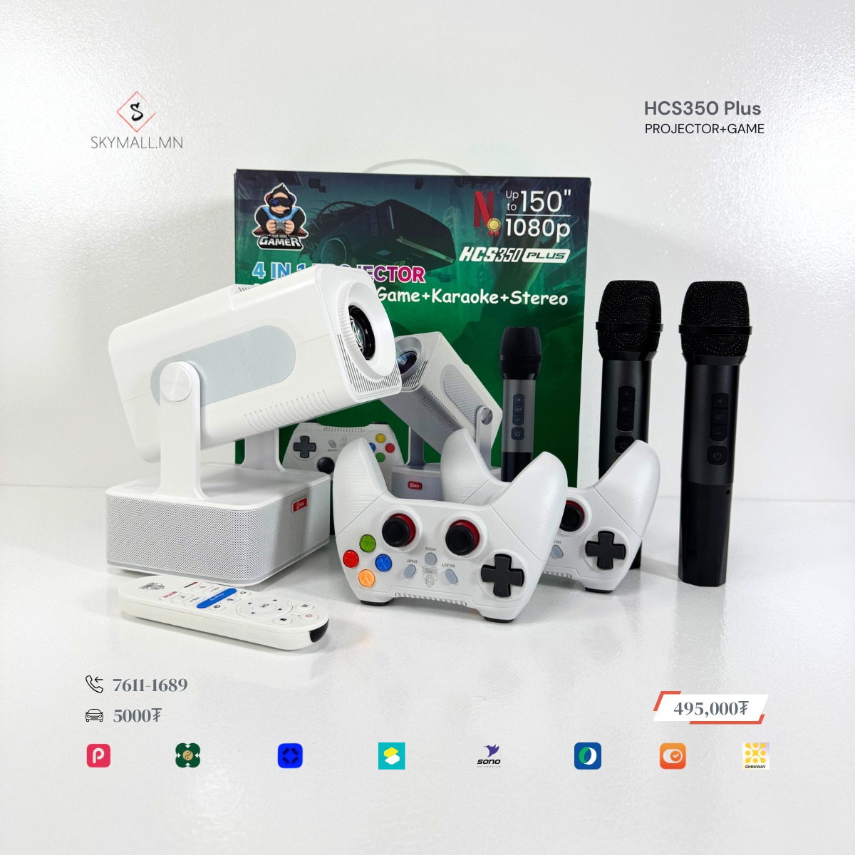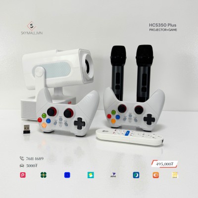Тус Зөөврийн smart projector нь karaoke microphone 2 ширхэг, тоглоомын console 2 ширхэгтэй WIFI-аар интернэт холбогддог өөр дээр Youtube, Spotlfy, Netflix, ATV, Prime video, HBOMAX тэй мөн, 1990-2000 оны алдартай #RETRO тоглоом болох #Contra, #Mario, #Tank гэх мэт 10,000+ тоглоомтой. Цагийн зугаатай өнгөрүүлээрэй. 150 инч